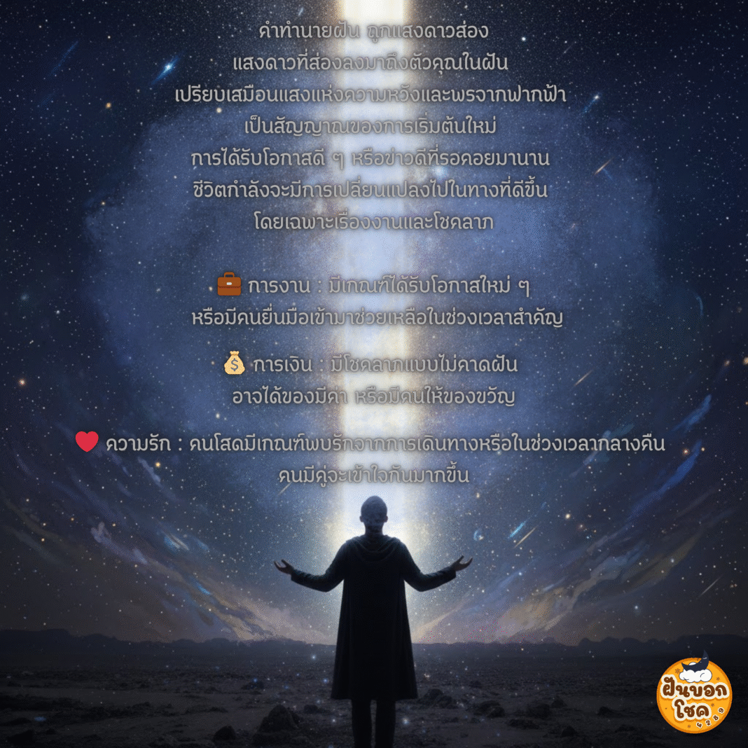 แสงดาวที่ส่องลงมาถึงตัวคุณในฝัน เปรียบเสมือนแสงแห่งความหวังและพรจากฟากฟ้า เป็นสัญญาณของการเริ่มต้นใหม่ การได้รับโอกาสดี ๆ หรือข่าวดีที่รอคอยมานาน ชีวิตกำลังจะมีการเปลี่ยนแปลงไปในทางที่ดีขึ้น โดยเฉพาะเรื่องงานและโชคลาภ