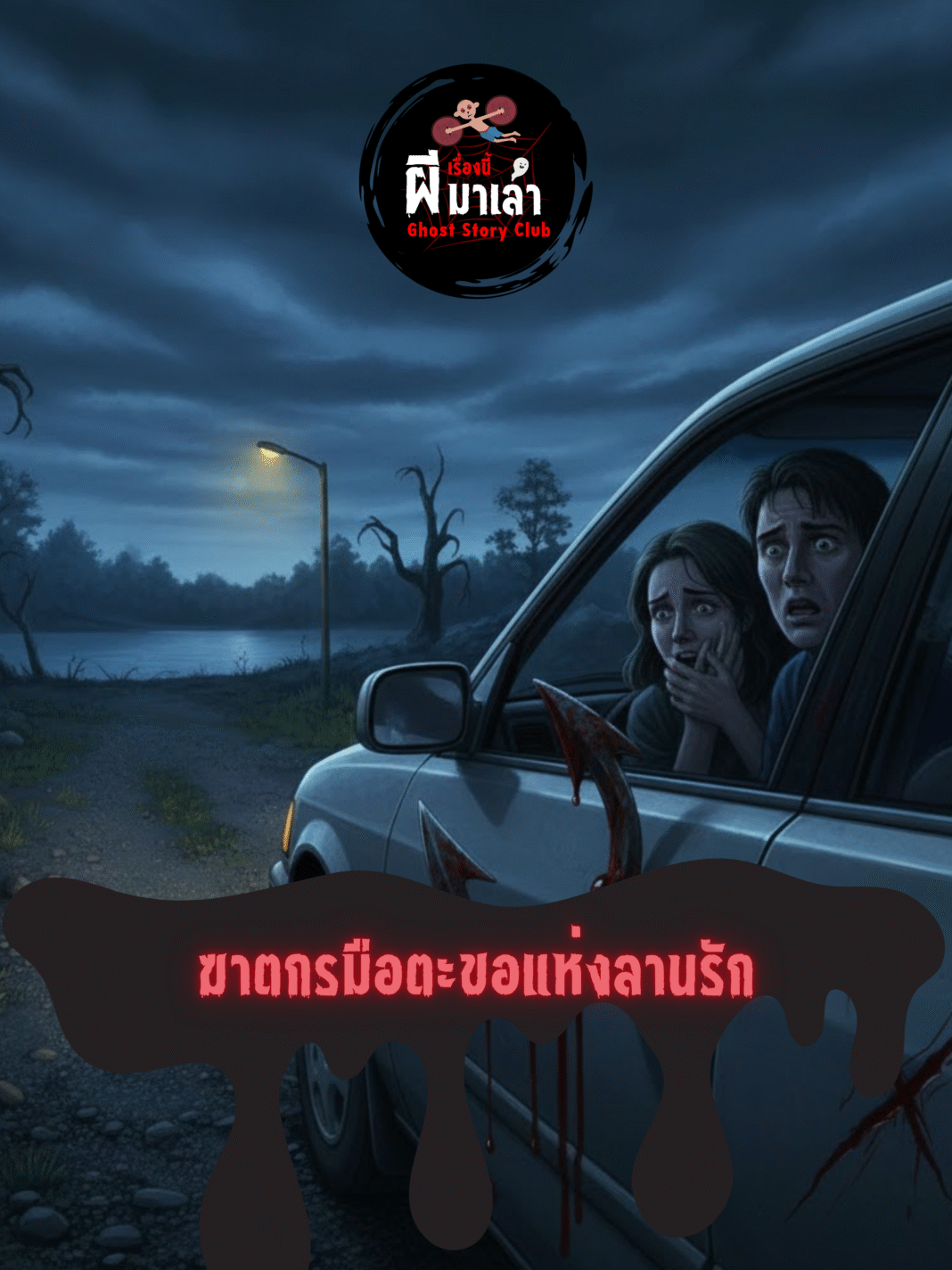 เขาพูดพลางเปิดประตูรถ แต่เมื่อเขากำลังจะก้าวขึ้นรถ แสงจันทร์ที่สาดส่องลงมาก็ทำให้เขาเห็นอะไรบางอย่าง… บางอย่างที่ห้อยติดอยู่กับที่จับประตูรถฝั่งที่เอมนั่งอยู่… มันคือตะขอเหล็กที่เปื้อนเลือดสดๆ… ปลายแหลมคมของมันเกี่ยวคาอยู่กับร่องของที่จับประตู ราวกับว่าเจ้าของของมันเพิ่งจะกระชากมือออกไปอย่างแรง…ตอนที่เขาขับรถออกมา