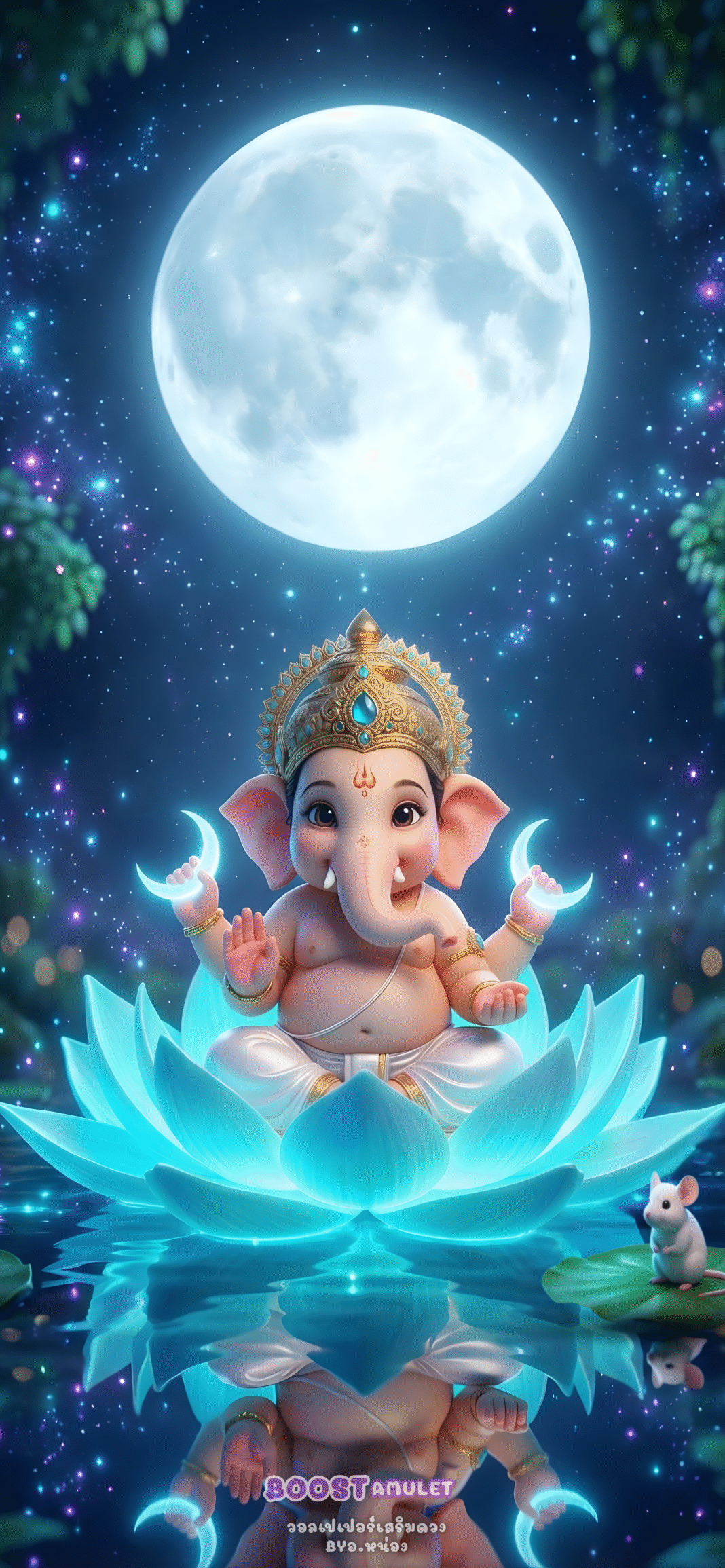 วอลเปเปอร์พระพิฆเนศปางเด็ก (Baby Ganesha) ในธีมสีฟ้ายามค่ำคืนพร้อมพระจันทร์เต็มดวงนี้ มีความหมายที่เป็นมงคลและสื่อถึงพลังงานด้านบวกที่นุ่มนวลแต่ทรงพลัง ดังนี้ครับ