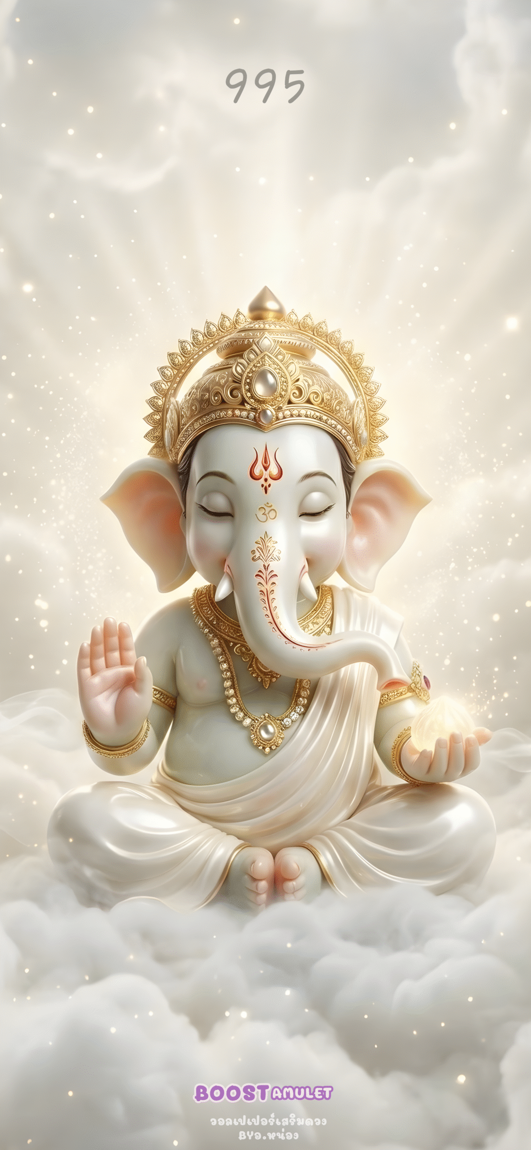 - ความอุดมสมบูรณ์และโชคลาภ: มือซ้ายที่ประคองลูกแก้วเรืองแสงหรือขนมโมทกะ สื่อถึงความอุดมสมบูรณ์ ความเจริญรุ่งเรือง และสติปัญญาอันล้ำเลิศ แสงเรืองรองจากวัตถุที่พระองค์ทรงถือ และแสงนวลที่โอบล้อมรอบองค์เทพ บ่งบอกถึงพลังงานบวกและโชคลาภที่กำลังจะเข้ามาในชีวิต